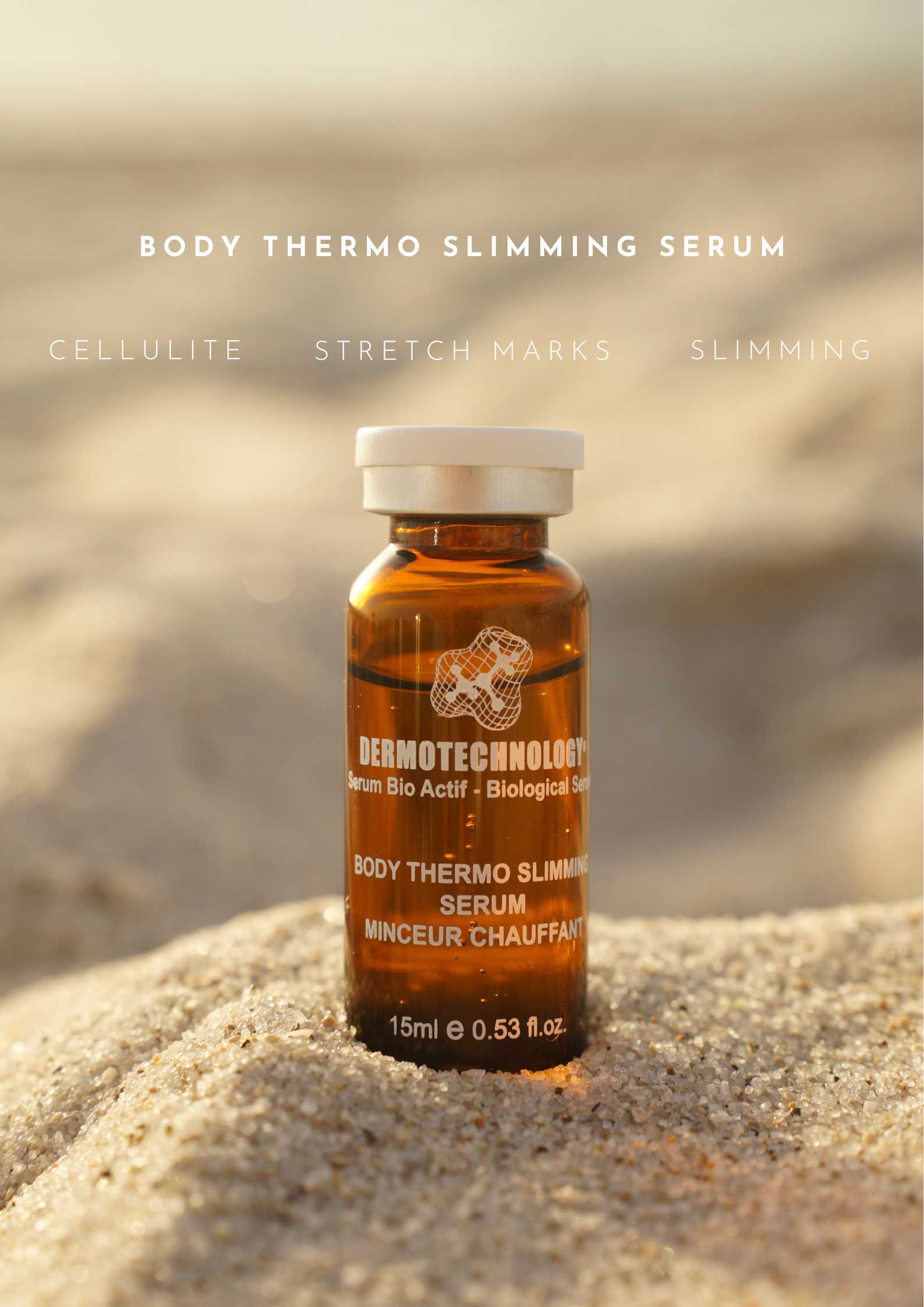 Dermotechnology display designed to showcase the Body Thermo Slimming Serum in a clean and professional way.