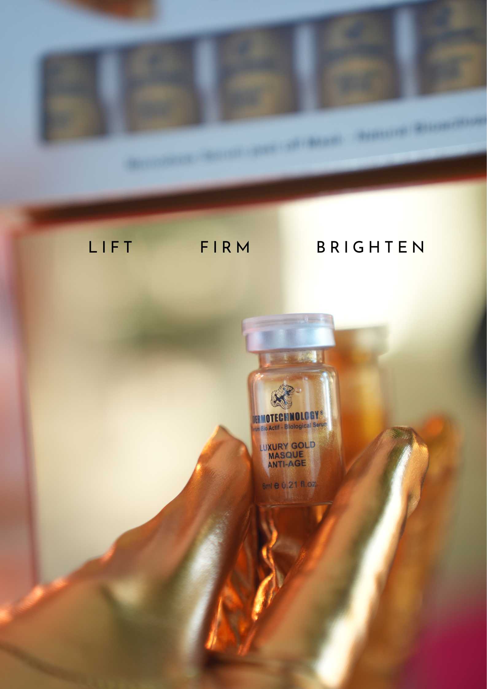 The Dermotechnology gold mask display is designed to highlight premium anti-aging skincare solutions in professional and retail environments. This gold mask display presents a clean, modern, and luxurious aesthetic aligned with Dermotechnology’s high-end brand identity.